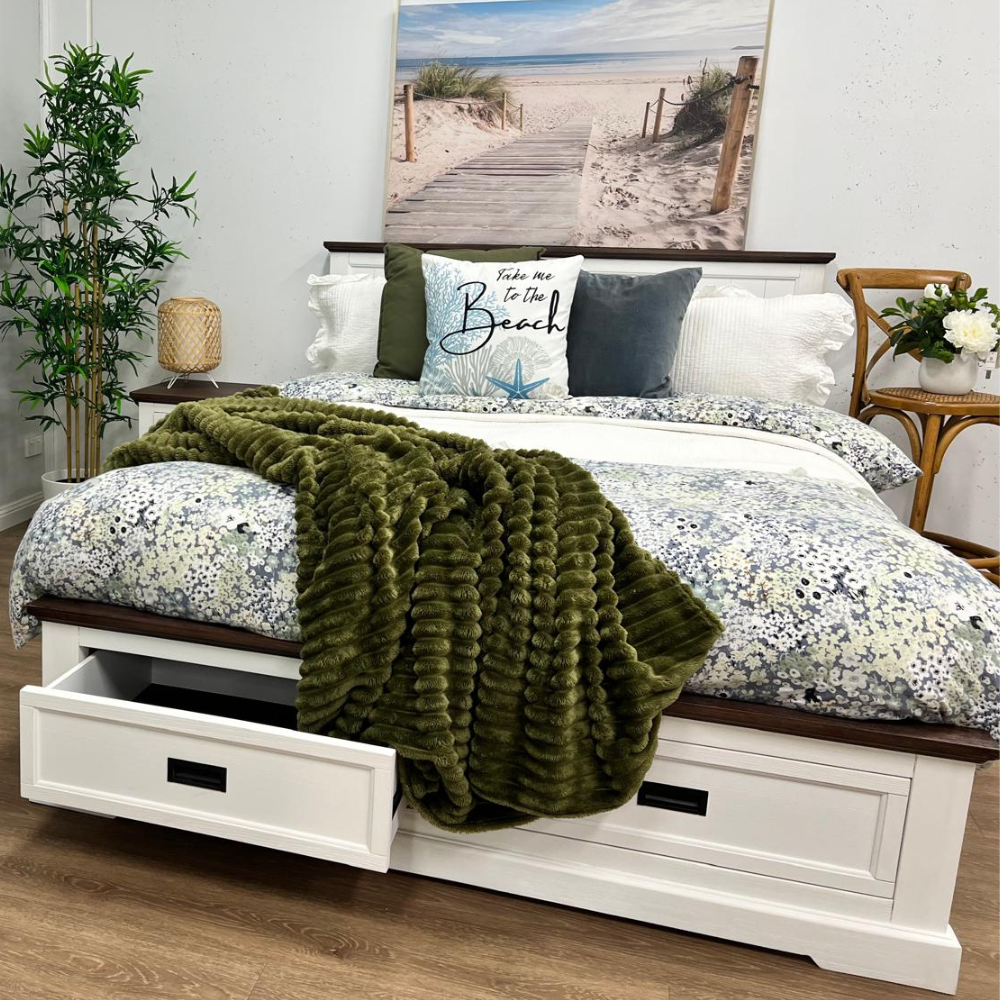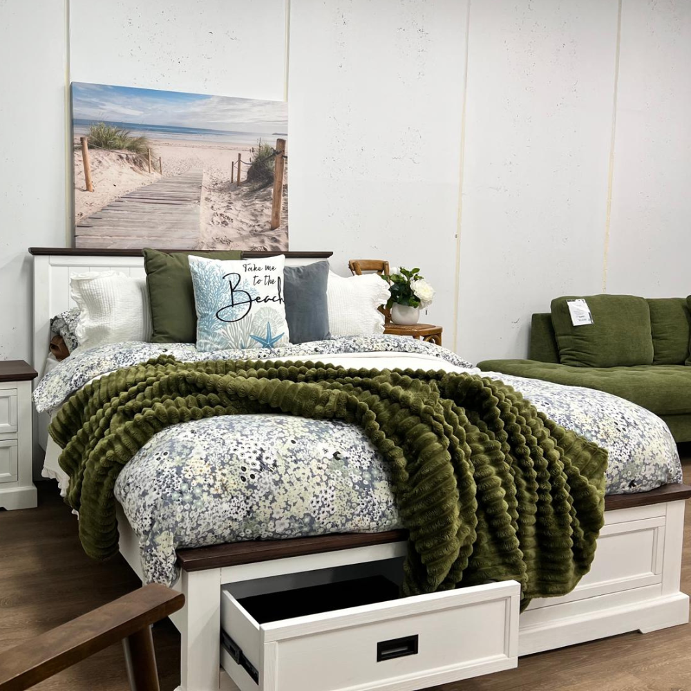 Elevate your bedroom with the Hampton Coastal Two-Tone Bed with Storage Drawers, a stunning blend of classic coastal charm and modern functionality. Expertly crafted from solid Australian Blackwood Timber, this bed features a brushed white frame with a rich walnut headboard and footboard, creating a timeless two-tone aesthetic.