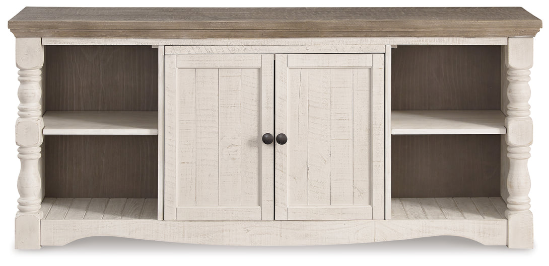 Set the tone for modern farmhouse living with the Havalance Extra Large TV Unit. Featuring a distressed weathered grey top and vintage white base, this entertainment unit combines charming rustic aesthetics with practical design. Its turned post legs and aged iron-colour hardware add visual weight, while open shelving and cabinet space ensure plenty of room for your media components.