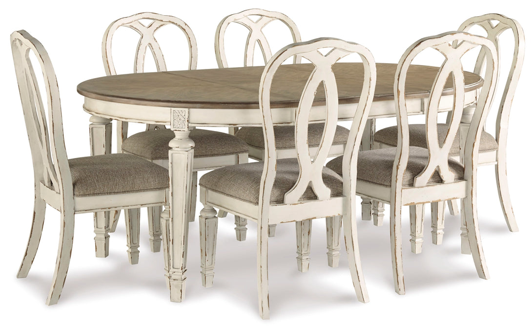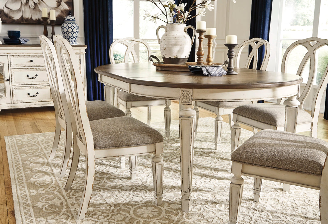 Serve up elegant French country flair with the Realyn 7-Piece Oval Dining Set. This beautifully crafted set includes an extendable oval dining table in a distressed wood finish with a chipped white base, paired with six ribbon back side chairs. The table extends easily with a drop-in leaf to seat up to six guests, making it ideal for both everyday meals and entertaining. Each chair features a stylised round ribbon back and cushioned seat for added comfort and sophistication.
