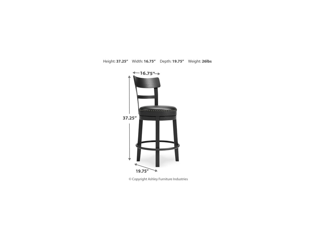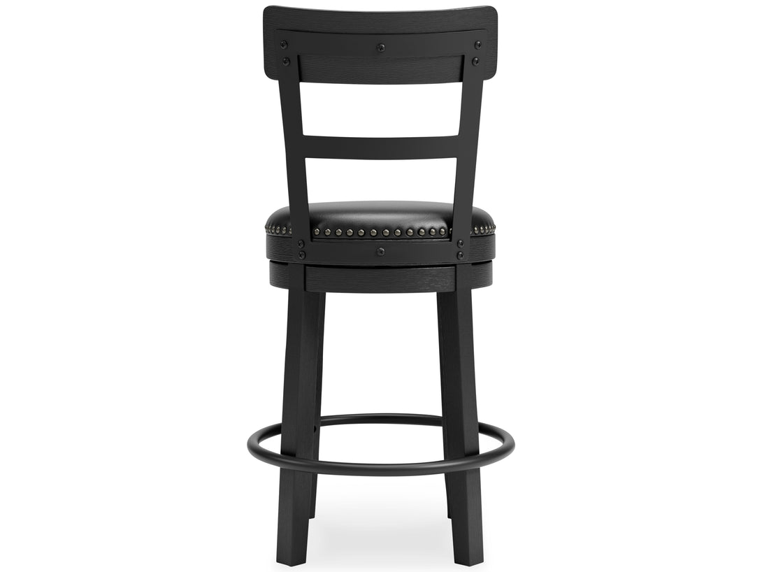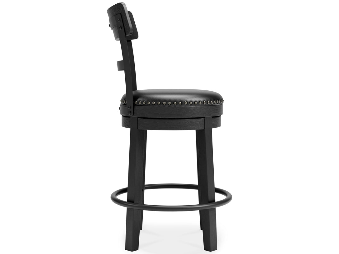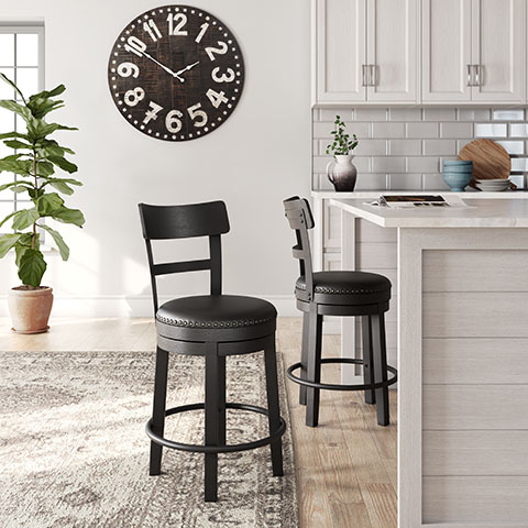 Make a bold statement in your kitchen or entertaining space with the Valebeck Swivel Counter Stool. Built with a sturdy solid wood frame in an antiqued black finish, this stool features a supportive contoured backrest and foam cushioned seat upholstered in easy-to-clean black faux leather. Designed for comfort and versatility, it offers smooth 360-degree swivel functionality, detailed nailhead trim, and industrial metal accents—making it ideal for both modern farmhouse and contemporary interiors.