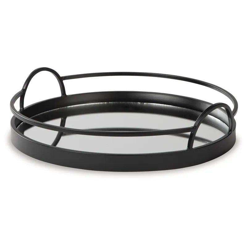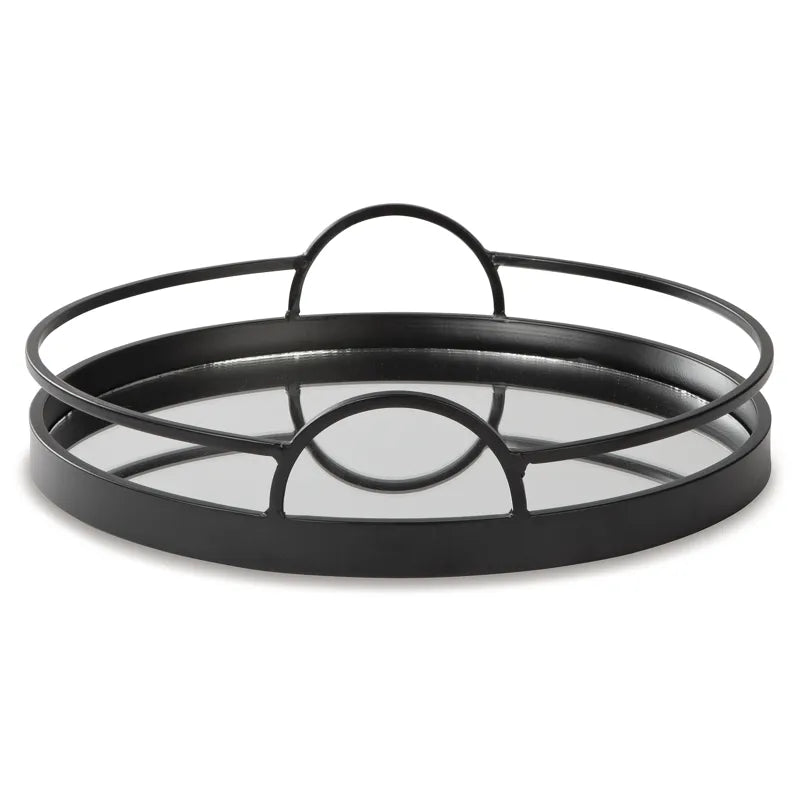 Bring sleek sophistication to your home decor with the Adria Round Black Mirrored Tray. Crafted from sturdy metal with a chic black painted finish, this tray features a reflective mirrored glass base and raised railings to keep items secure. Perfect for showcasing candles, perfumes or decorative pieces, it adds a refined touch to any tabletop or dresser.