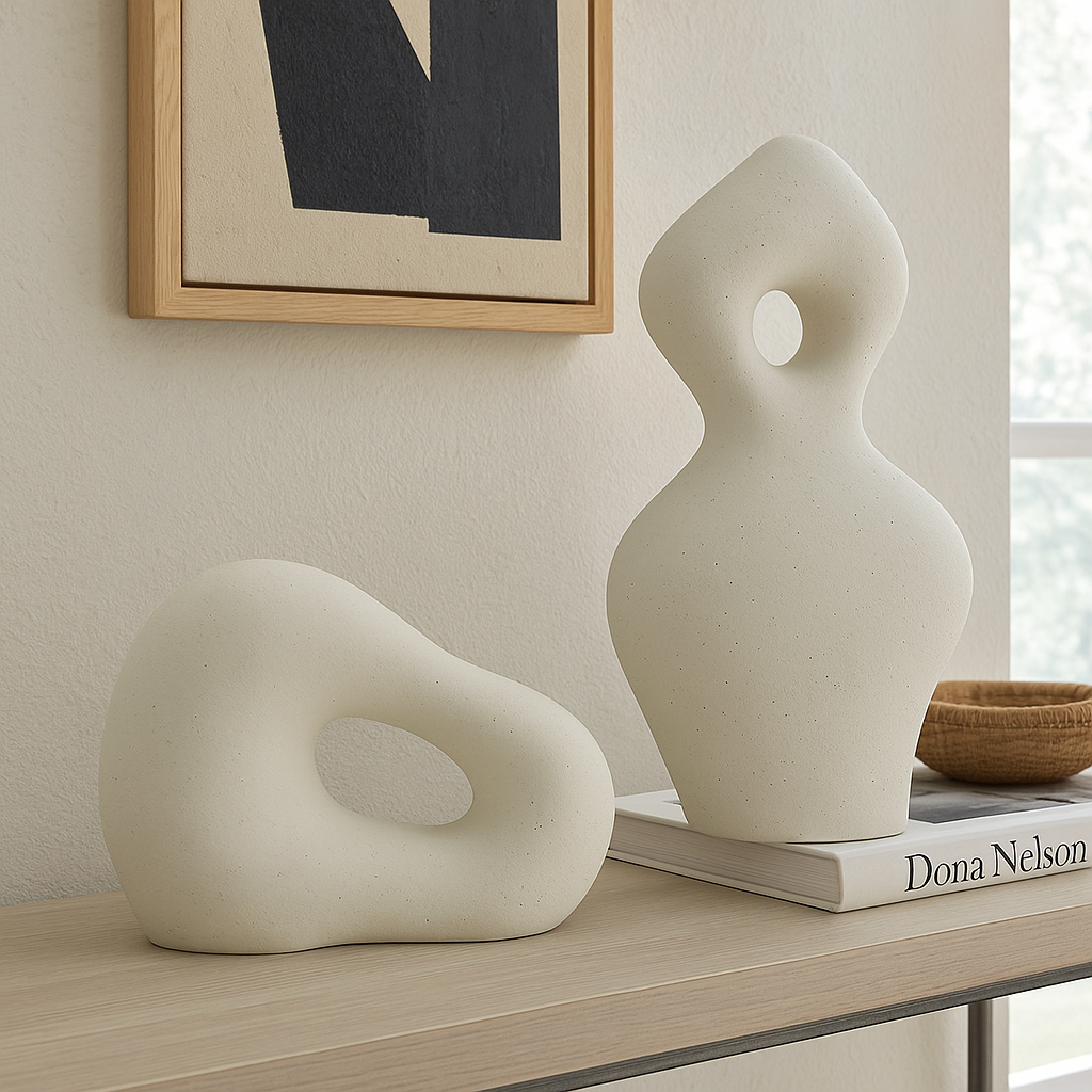 Elevate your home styling with the Arthrow Ceramic Sculpture Set. This curated duo features two uniquely shaped ceramic art pieces, both in a soft off-white sanded finish that complements any neutral-toned or minimalist interior. Each sculpture offers a distinct form that flows with visual movement—perfect for accent tables, consoles, or bookcases. Display them together for a cohesive look or style them separately to add harmony across your space.