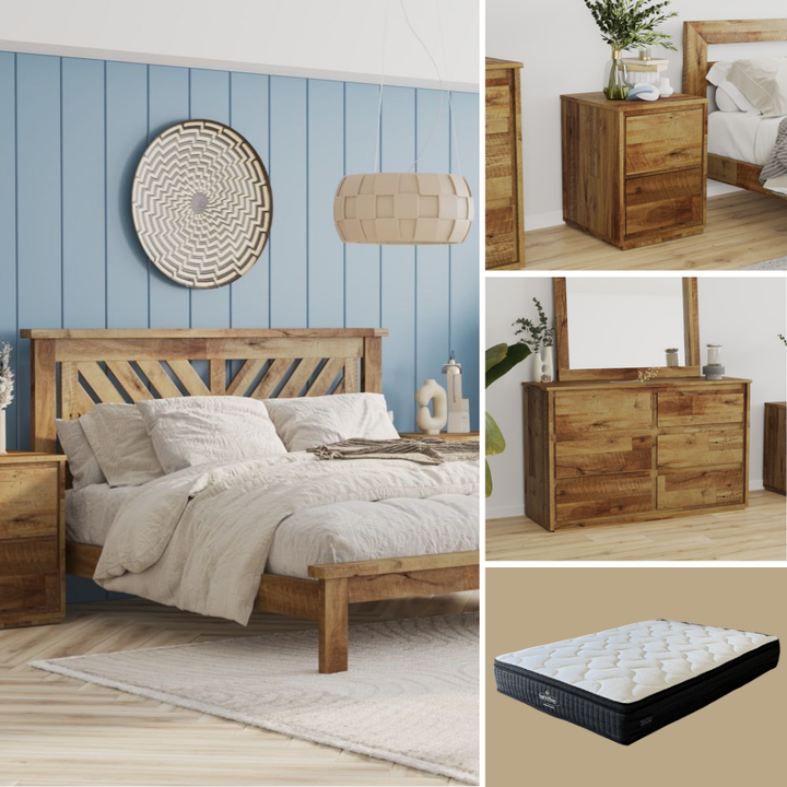 This 5-piece bedroom set is designed to bring both style and functionality to your home. It features durable reclaimed timber construction and timeless design.