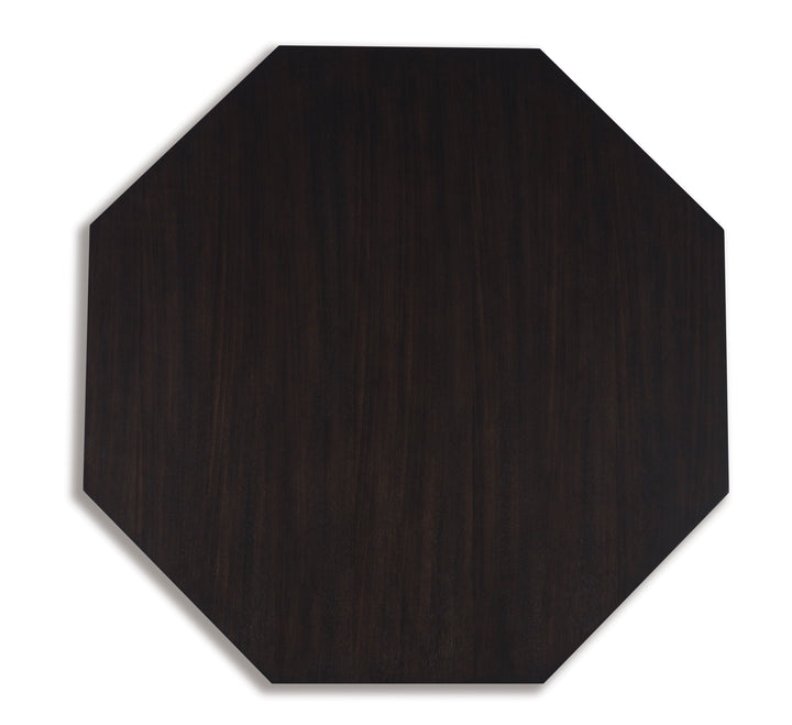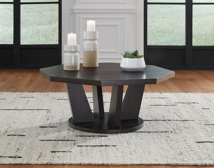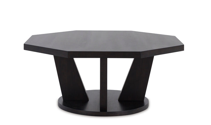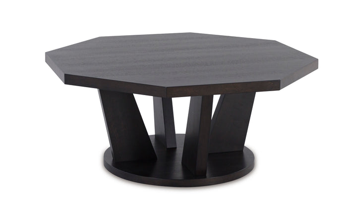 For the ultimate in casual contemporary styling, accent your sofa or loveseat with the chic Chasinfield coffee table. Designed with an octagonal top and trapezoid-shaped legs, its geometric elements create a bold, eye-catching look.