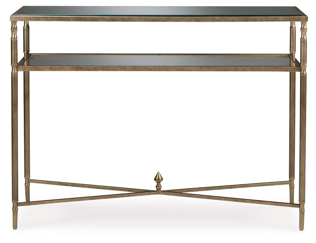 Bring refined elegance into your entryway or behind your sofa with the Cloverty Hall Stand Table. Crafted from metal and glass, this timeless piece features an aged goldtone frame with reeded, bobbin-style legs and a detailed stretcher finial. The mirrored top adds a luxe touch, while the clear glass shelf offers practical display or storage space—making it as functional as it is stylish.