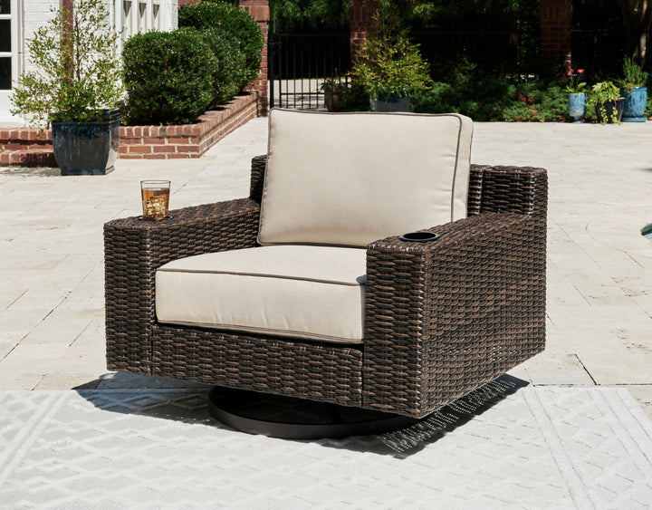 Who says the great outdoors isn’t made for luxury living? The Coastline Bay swivel lounge chair offers all the high-end design, plush cushioned comfort and durability you could ask for, and then some. Its all-weather, rust-proof aluminum frame provides the easy-breezy wicker look you love without the high maintenance. Lounge about and swivel all around to take in the view. Built-in cup holder makes it that much easier to chillax. Rest assured, the high-performing Nuvella® fabric is made to stand up to the elements.