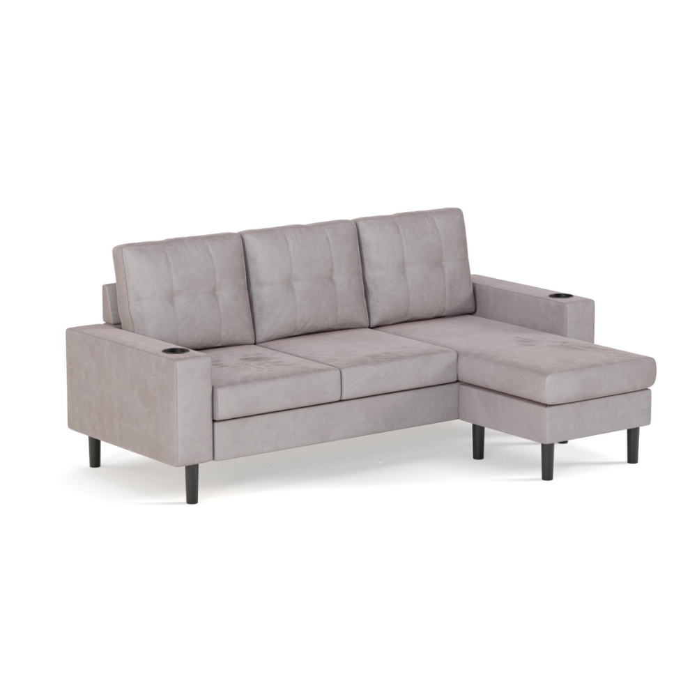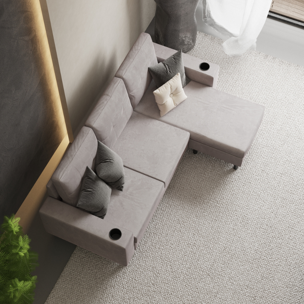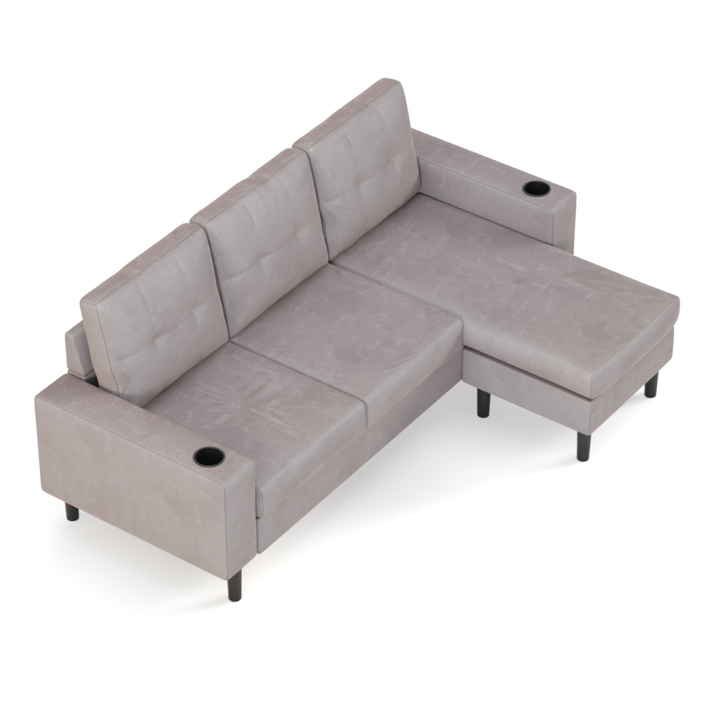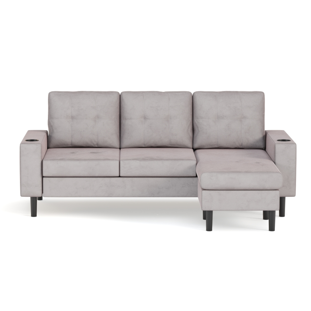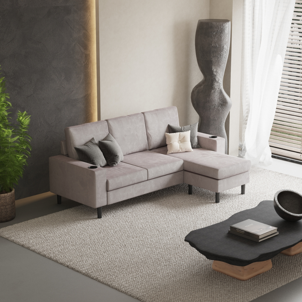 Bring comfort and modern style to your lounge with the Cosy Cove 3 Seater Sofa in Neutral Beige. Its reversible chaise and cup holders offer convenience and flexibility, perfect for any living space.