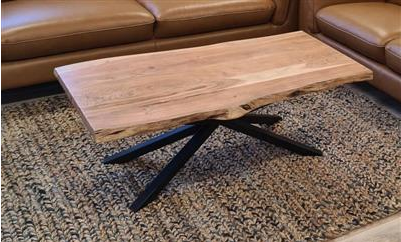 Solid Acacia Hardwood timber. Unique individual one offs design. 38mm Thick. Black Metal Cross legs.Colour:  Natural FULLY ASSEMBLED. Dimensions: 1300mm x 700mm x 450mm H