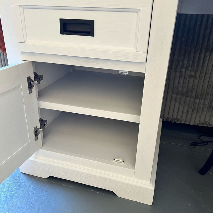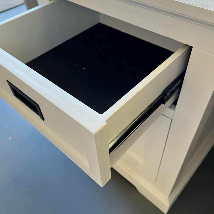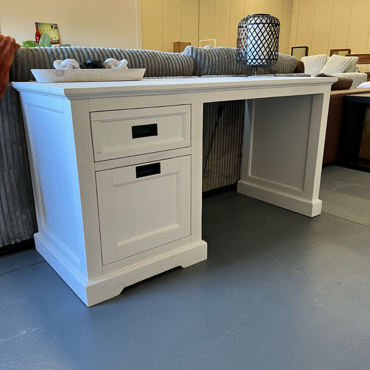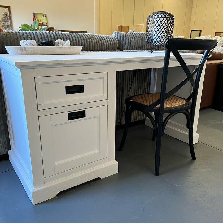 Bring rustic charm and modern functionality to your workspace with the Hampton Coastal Desk - White. Crafted from quality timber with a white brushed finish, this desk offers spacious storage with a drawer and cabinet. Built to last and ideal for coastal or Hamptons-style interiors.
