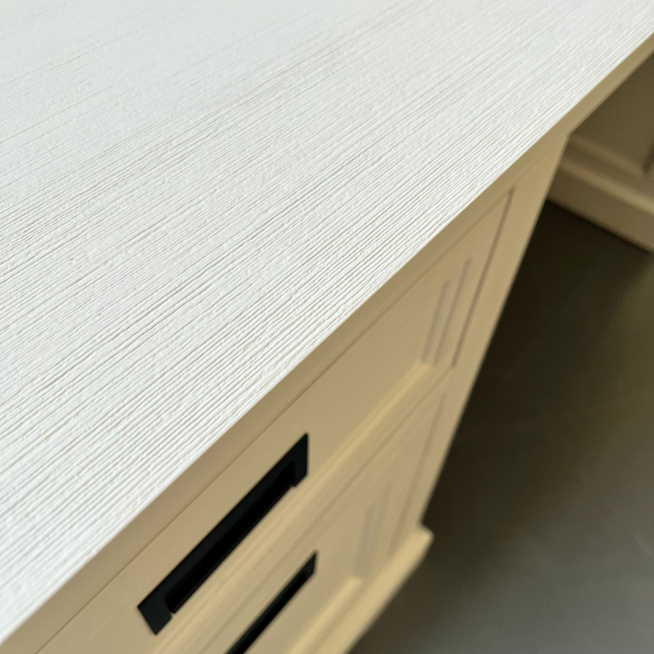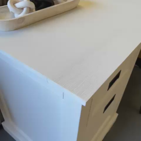 Enhance your workspace with the timeless elegance of the Hampton Coastal Desk in white. Designed with a brushed timber finish and classic panelling, this desk blends coastal charm with practical storage solutions.