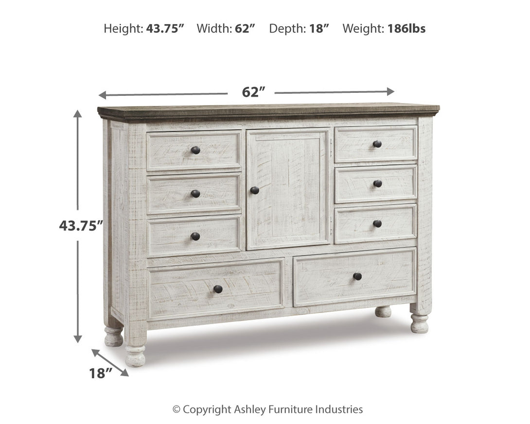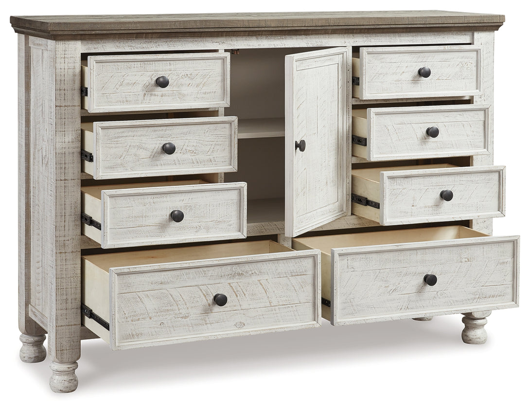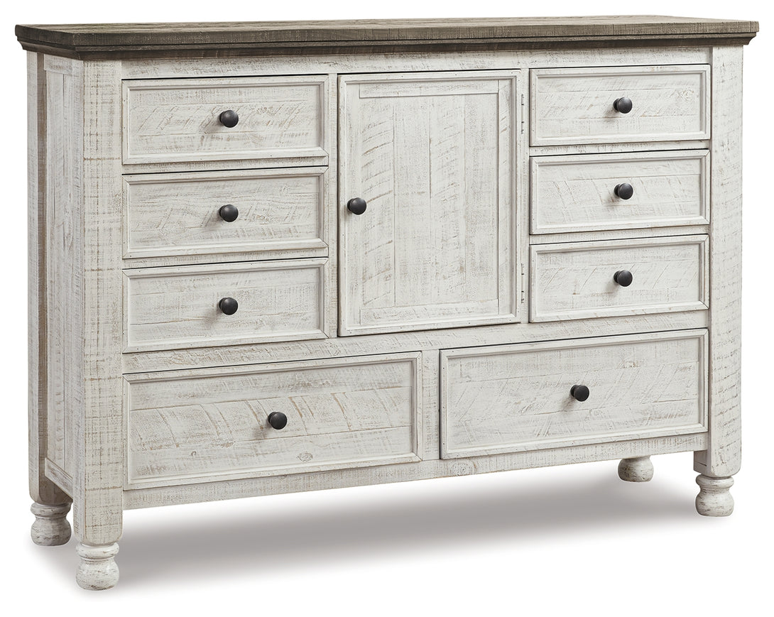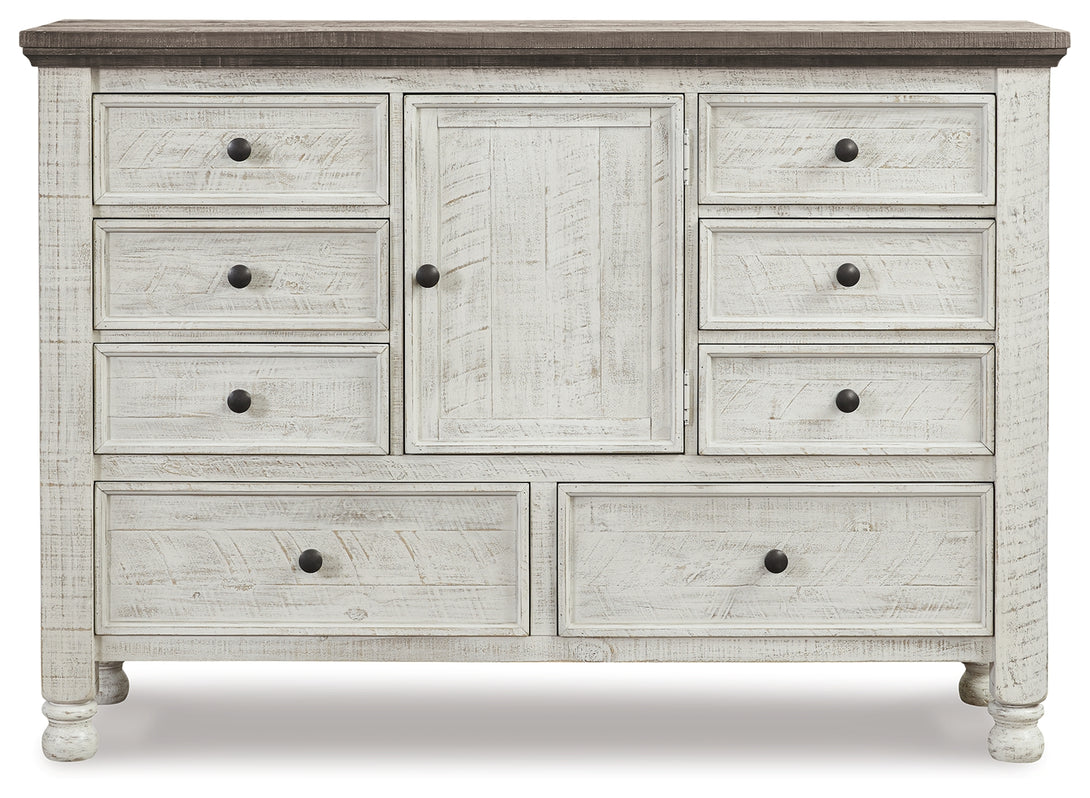 Bring vintage charm and everyday functionality to your bedroom with the Havalance Bedroom Dresser. This beautifully crafted piece features a distressed two-tone finish—weathered grey top and vintage white base—accented by turned posts and raised drawer fronts. With 8 smooth-gliding drawers, a centre cabinet with adjustable shelf, and felt-lined top drawers, it's a perfect mix of form and function.