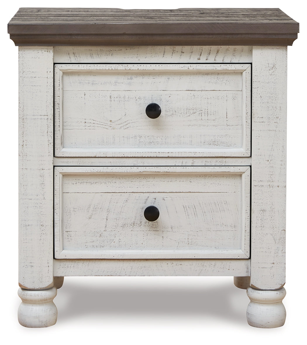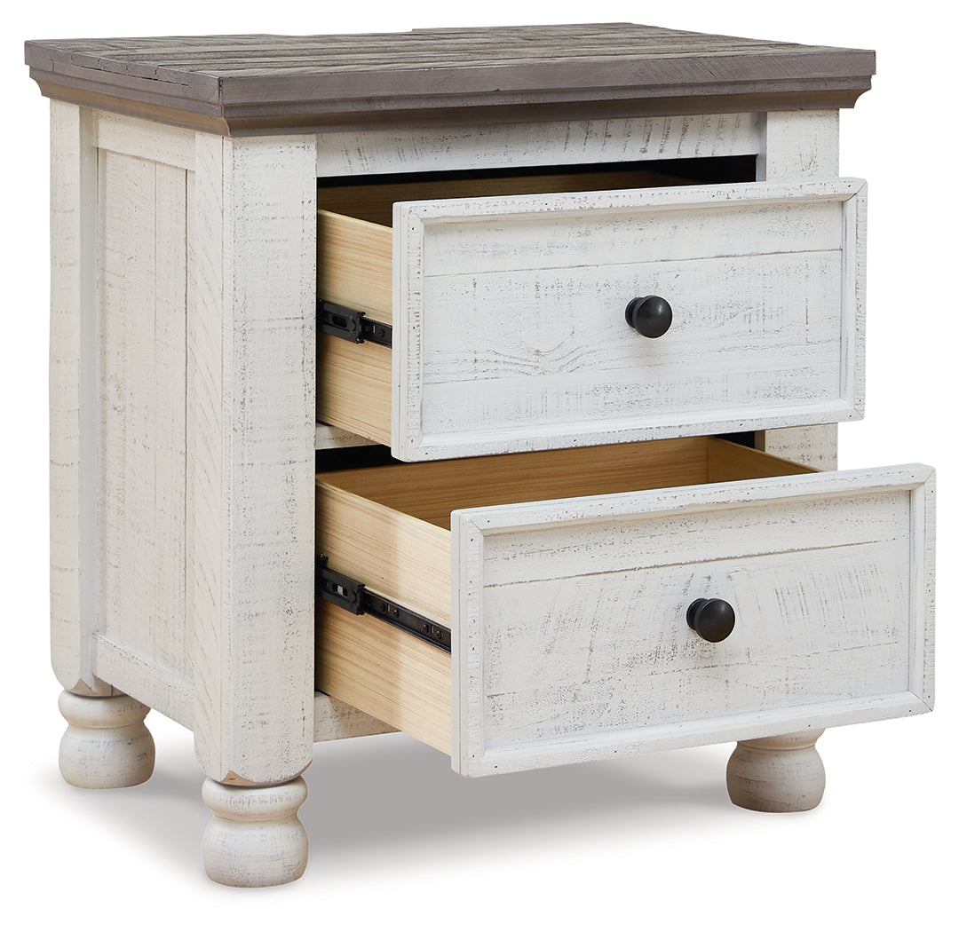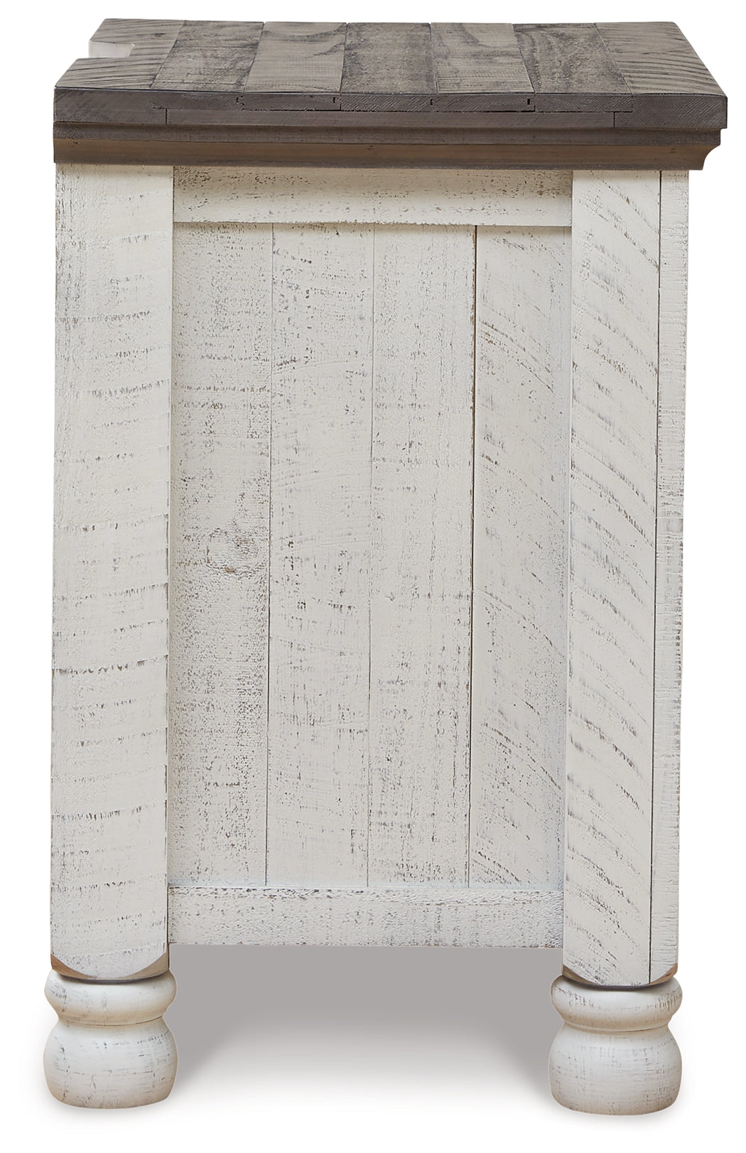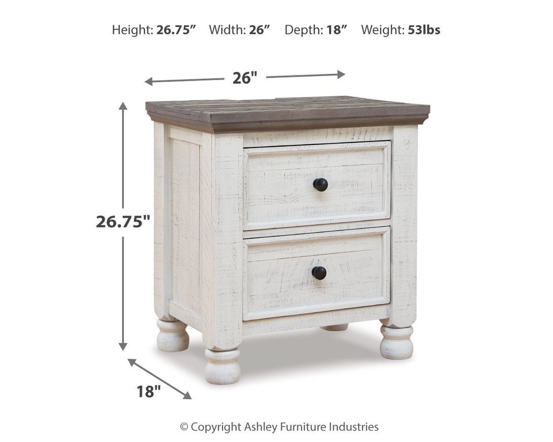 Bring timeless farmhouse style and everyday functionality to your bedroom with the Havalance Bedside Table with USB Charging. Designed with classic turned post accents, raised drawer fronts, and a thick-profile crown moulding, this nightstand is finished in a weathered grey top and vintage white base for a charming rustic touch. Modern conveniences like dual USB ports and AC power outlets are discreetly integrated for your bedside tech needs.