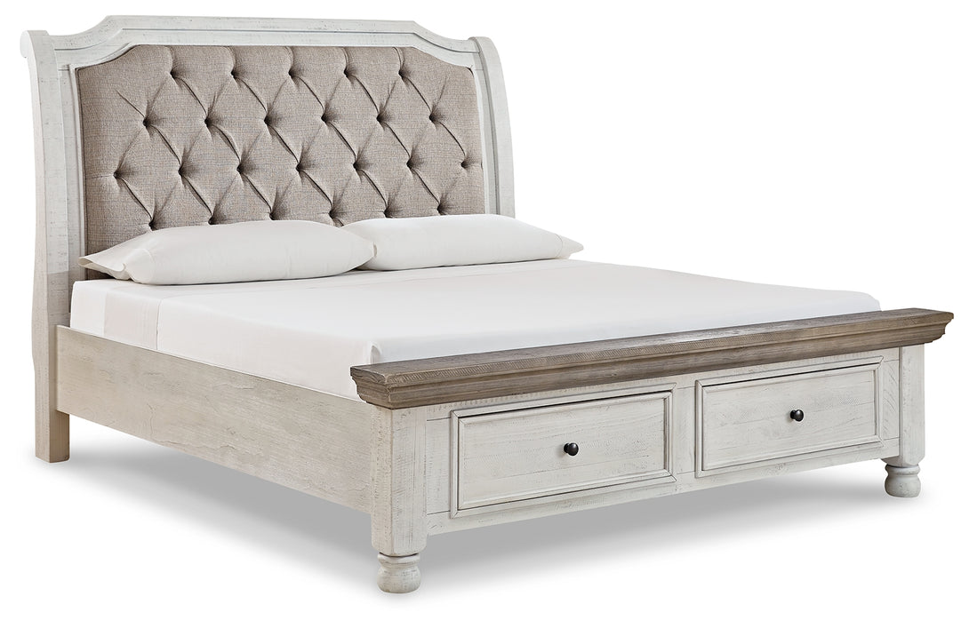 Grand farmhouse design meets practical luxury in the Havalance King Sleigh Bed with Storage. Showcasing a thick-profile sleigh headboard with soft oatmeal-coloured upholstery, turned posts, and raised panel detailing, this bed exudes timeless charm. Finished in distressed weathered grey and vintage white, it features two spacious drawers built into the footboard for discreet bedroom storage.