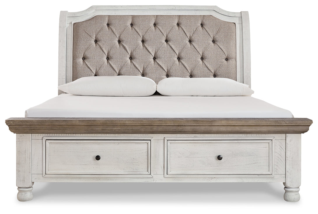 Rustic elegance meets modern function with the Havalance Queen Sleigh Bed with Storage. Inspired by American farmhouse design, this bed showcases a tufted upholstered sleigh headboard, turned post accents, and raised drawer fronts. The distressed two-tone finish in weathered grey and vintage white complements the oatmeal-coloured fabric headboard, while two integrated footboard drawers provide hidden storage for your bedroom essentials.