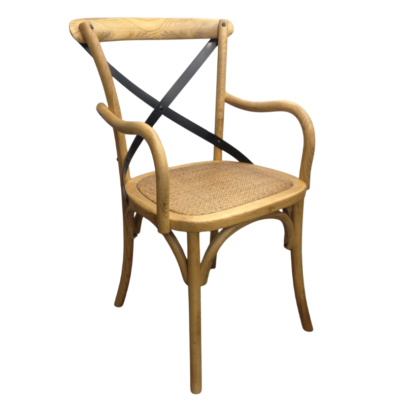 Infuse your dining area with a touch of rustic sophistication with the Industrial Crossback Carver Chair - Natural. Crafted from solid hardwood in a natural finish, this elegant chair blends classic French-inspired curves with industrial metal crossback detailing for a timeless look that suits both modern and traditional interiors.
