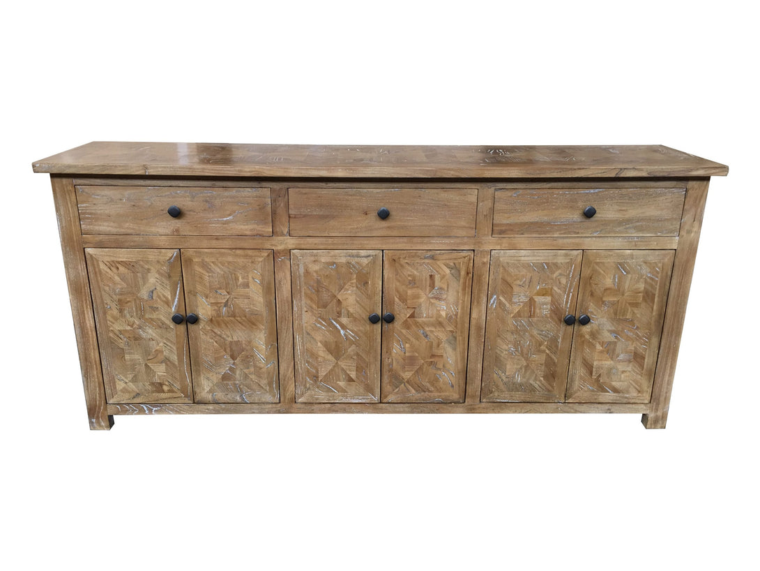 Kenthurst Royal 2000mm Buffet is the perfect blend of rustic elegance and practical storage. Expertly crafted from solid elm hardwood, this statement piece features a hand-laid parquetry pattern and a minimalist white wash that enhances the natural beauty of the timber.