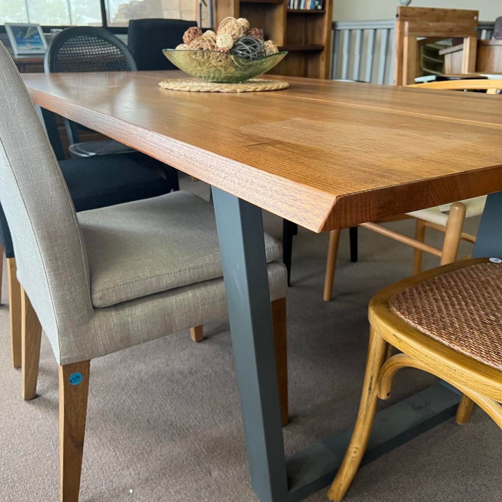 Bring timeless design and everyday durability to your dining space with the Maine 2000mm Dining Table. Crafted from solid Tasmanian Oak in a warm natural finish, this table features clean lines, a contemporary angled edge profile, and charcoal-finished metal legs for a modern industrial look. Built to last with exceptional quality and craftsmanship, it's the perfect centrepiece for family meals and entertaining guests alike.