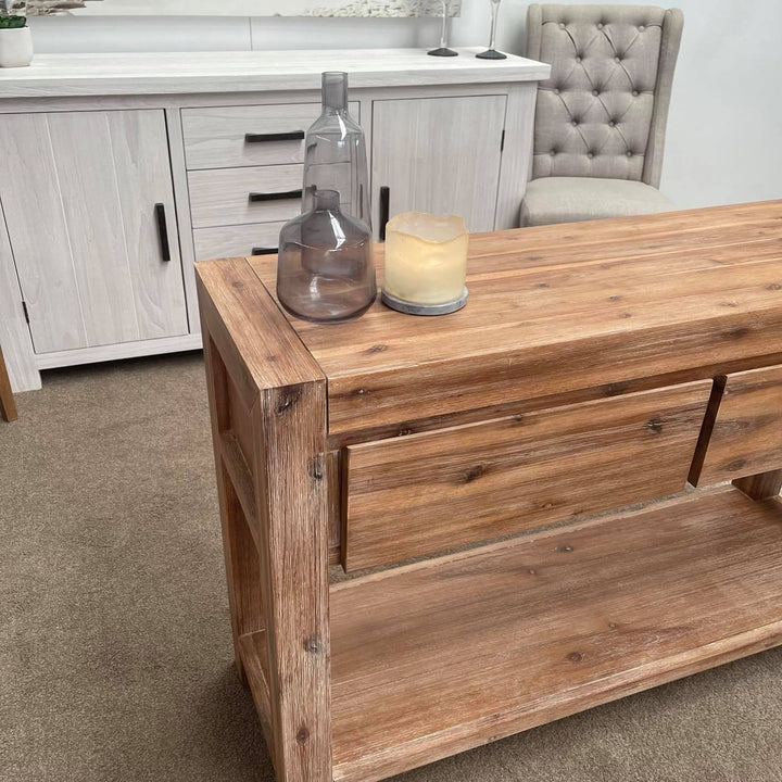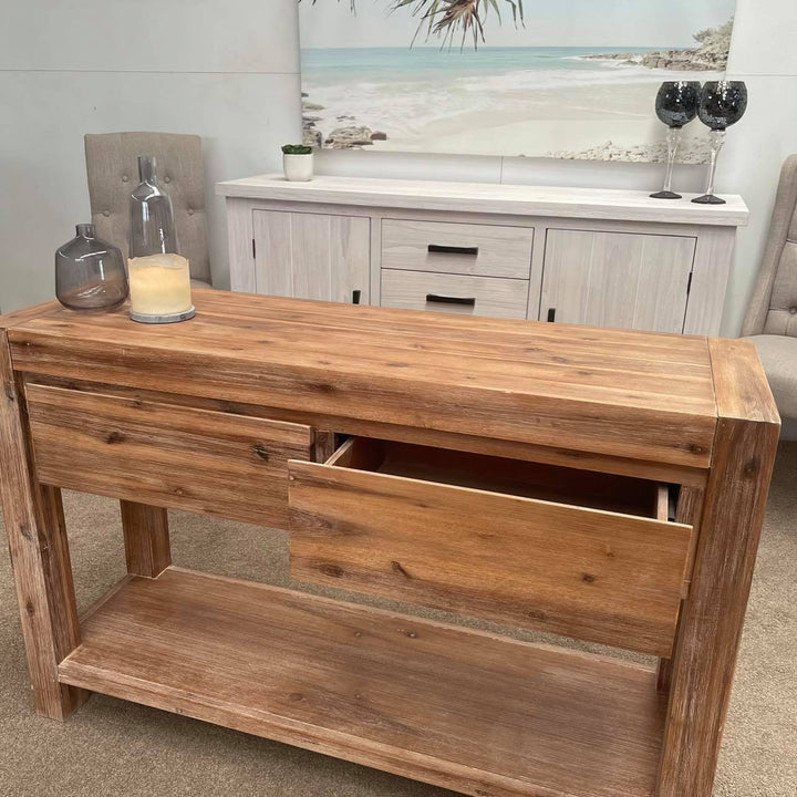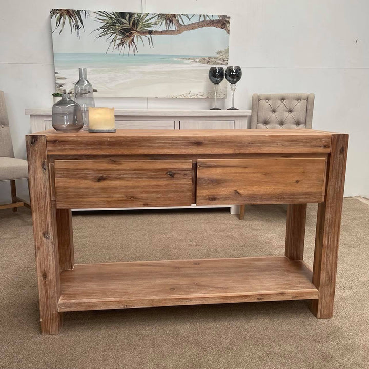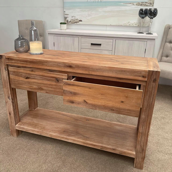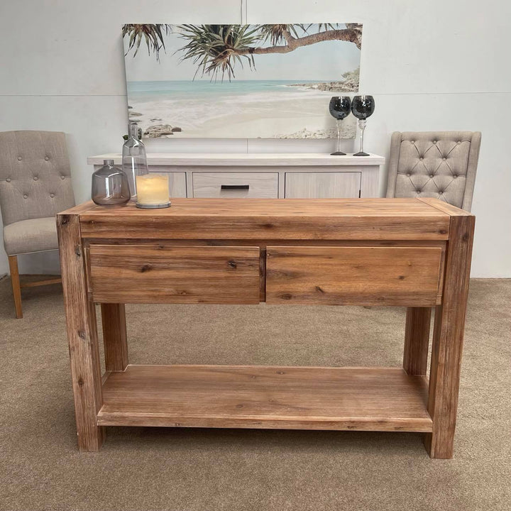 The hallstand includes two spacious drawers for storing essentials like keys, mail, or other accessories, while the open lower shelf provides ample space for decorative items, baskets, or shoes. Fully assembled for your convenience, the Silverwood Hallstand is the perfect addition to any home.