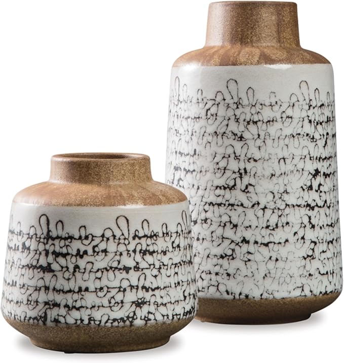 Two’s company with the Megan 2-Piece Decorative Vase Set. Featuring a distinctive contrast of cream, tan, and black, these ceramic vases bring an organic charm to your living or outdoor space. The looped black linework and smooth glazed finish express a primitive design aesthetic that feels modern and intentional.