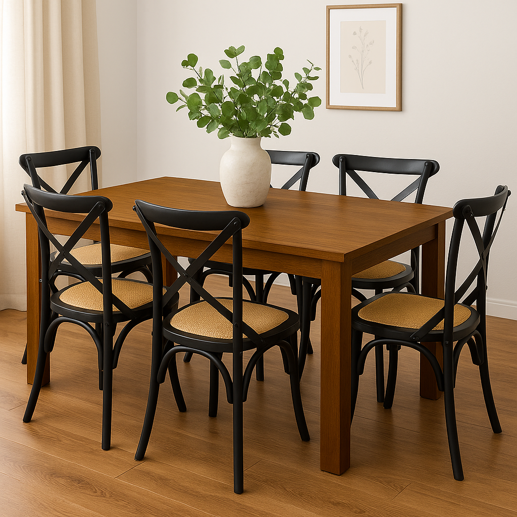 Upgrade your dining area with striking contrast and timeless design. This New Age 150cm Dining Table in Dark Oak is paired with 6x Black InStyle Cross Back Chairs, delivering a bold and modern look grounded in classic craftsmanship.