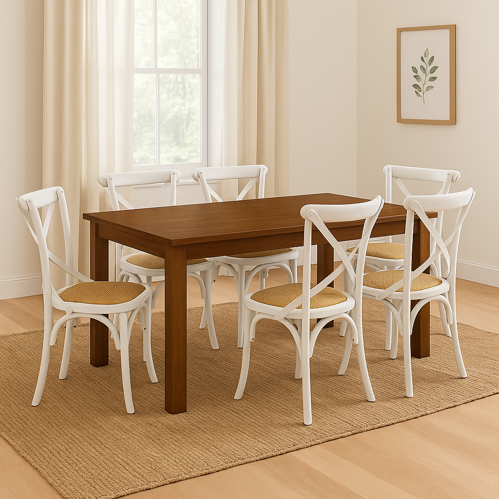 Crafted from solid hardwood, this 7-piece set is built to last, making it ideal for everyday use or special occasions. The table's clean lines and sturdy base complement the elegant cross-back design of the chairs, delivering both comfort and style.