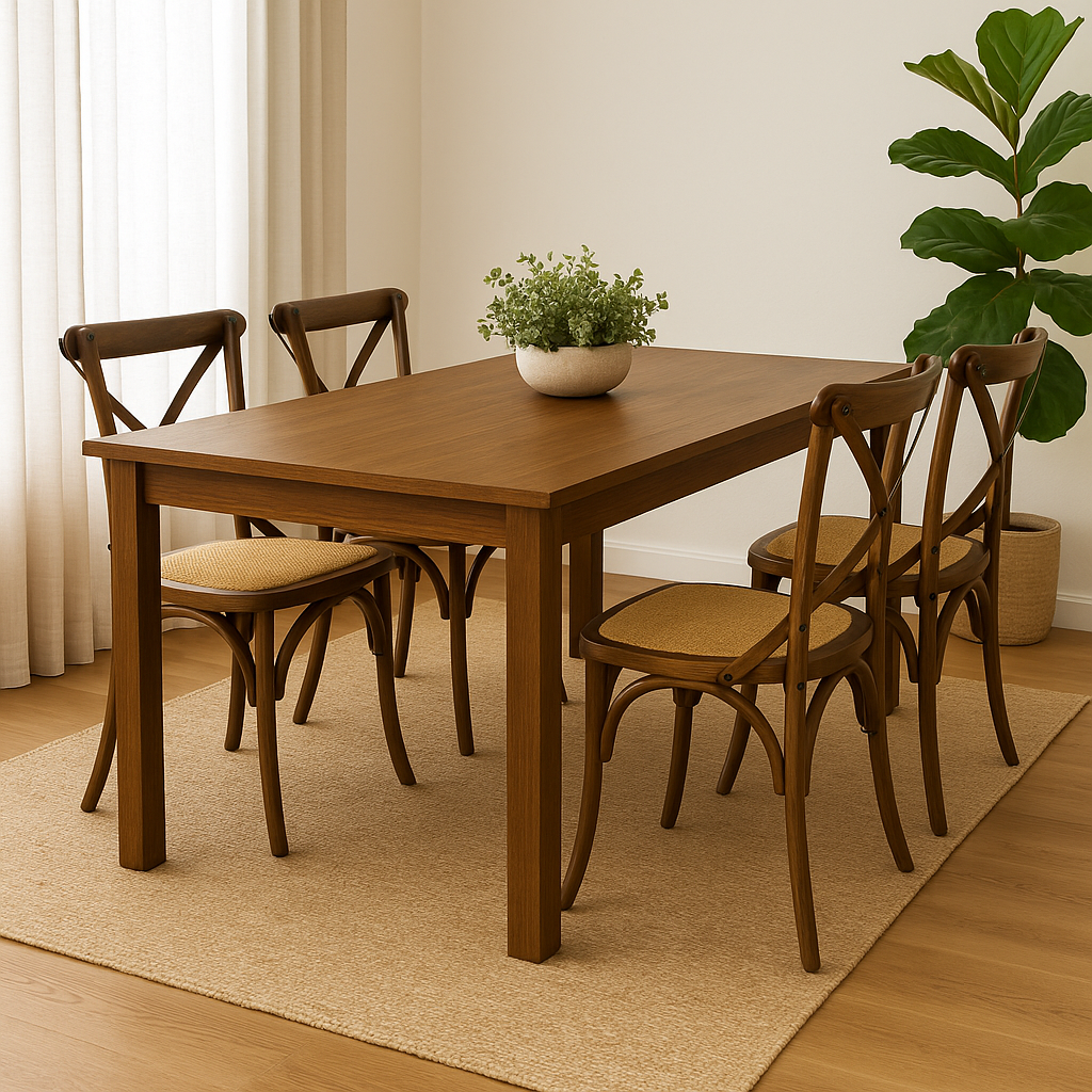 Bring rustic charm and durable craftsmanship to your dining space with the New Age 150cm Dining Table and 4x InStyle Cross Back Chairs in rich Dark Oak. Built to last and styled to impress.
