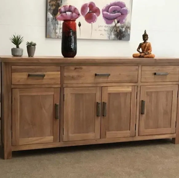 The New Age Deluxe 2100mm Buffet, formerly known as the Savannah Deluxe, is beautifully crafted from solid Mountain Ash hardwood timber, finished in a natural color that highlights the wood's stunning grain. This spacious buffet comes fully assembled and ready to use, offering both elegance and practicality for your dining or living area.