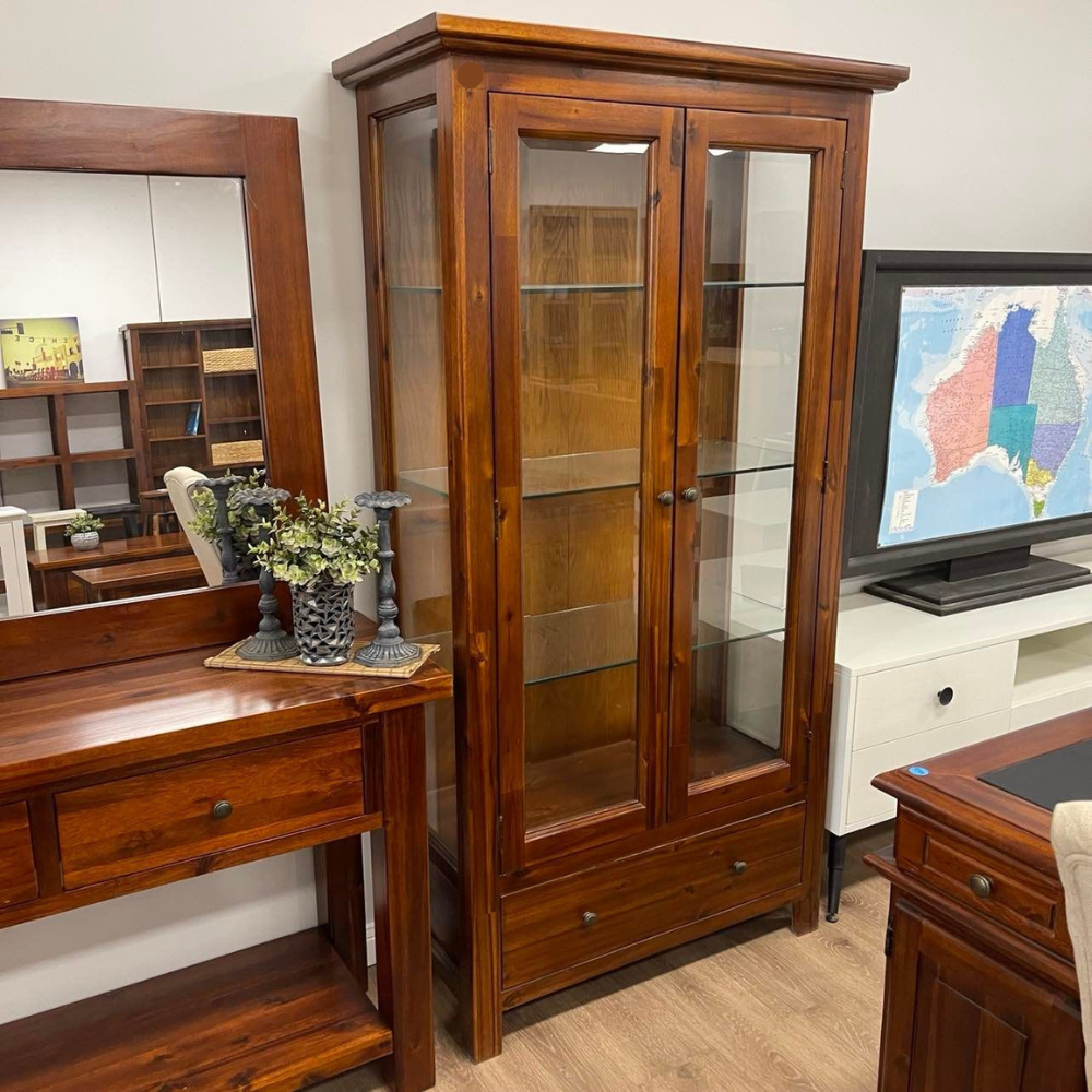Elevate your home with the elegant New Age Monash Glass Cabinet, designed to showcase your finest decor and collectibles. Crafted from solid Australian hardwood timber in a rich Ironbark finish, this cabinet exudes timeless charm. Featuring glass-paneled double doors, three sturdy glass shelves, and a spacious storage drawer at the base, it offers both style and functionality.