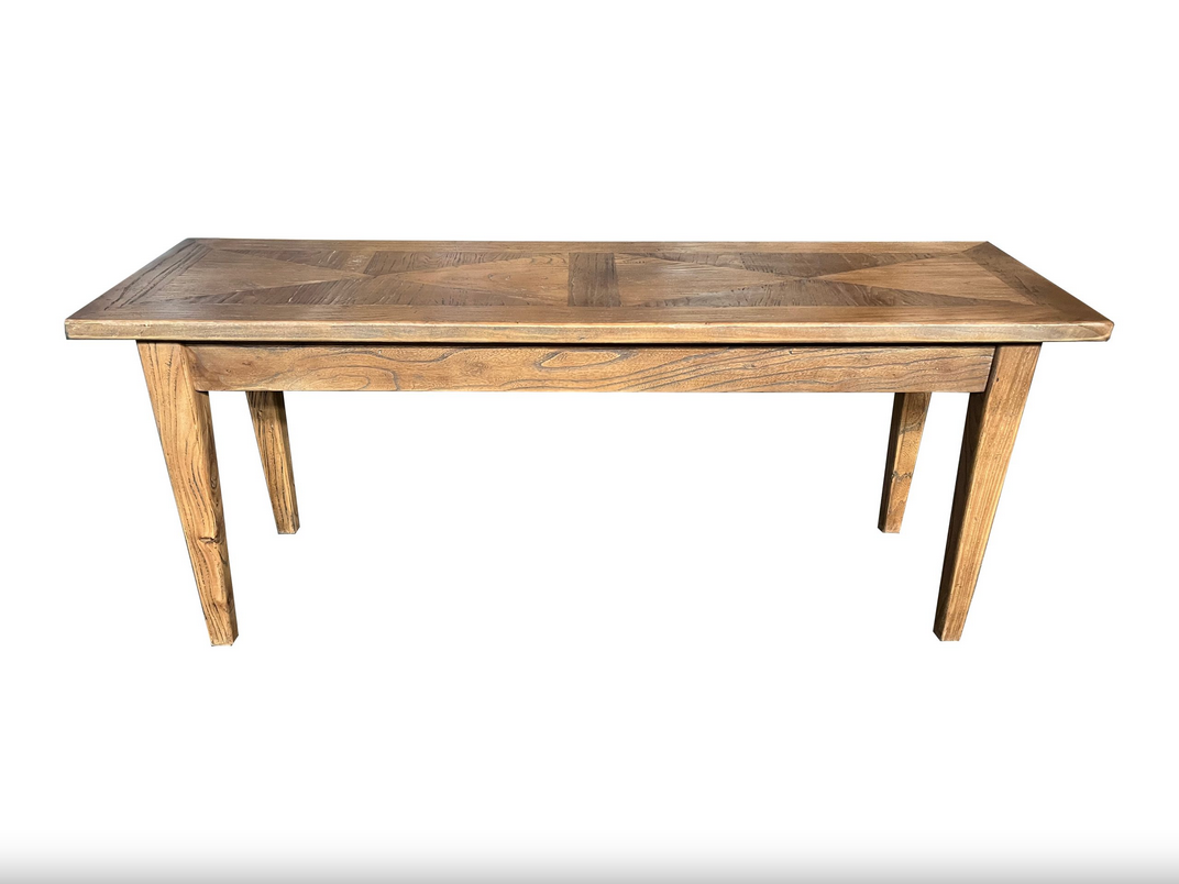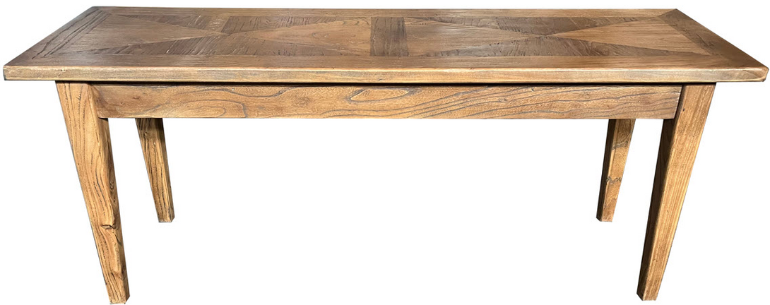 Crafted from reclaimed elm timber, the Parquetry Dining Table offers an exquisite blend of rustic charm and timeless elegance. The intricate parquetry design on the tabletop adds a sophisticated touch, showcasing expert craftsmanship and the natural beauty of the wood grain. With its robust construction and versatile style, this table is built to complement a variety of interior décors, from traditional to modern.