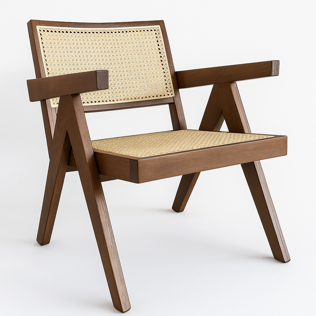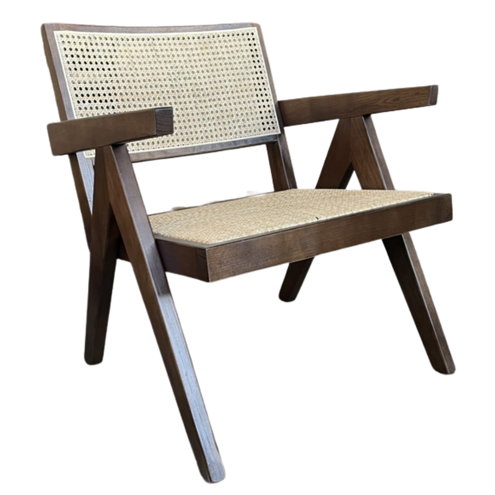 Elevate your living space with the Portland Lounge Chair in Walnut. A rich timber tone meets relaxed comfort with a rattan weave and stylish armrests—perfect for reading nooks or quiet corners.