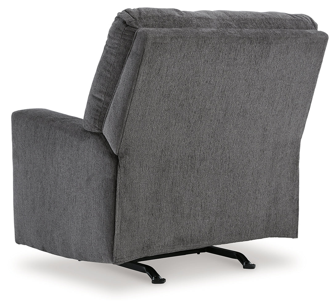 Add comfort and style to your living space with the Rannis Rocking Recliner. Featuring a clean, contemporary design, this recliner offers a soothing rocking motion and easy pull-tab reclining. Crafted with reinforced frame construction, high-resiliency foam cushions, and durable polyester upholstery, it’s built to last for everyday use.