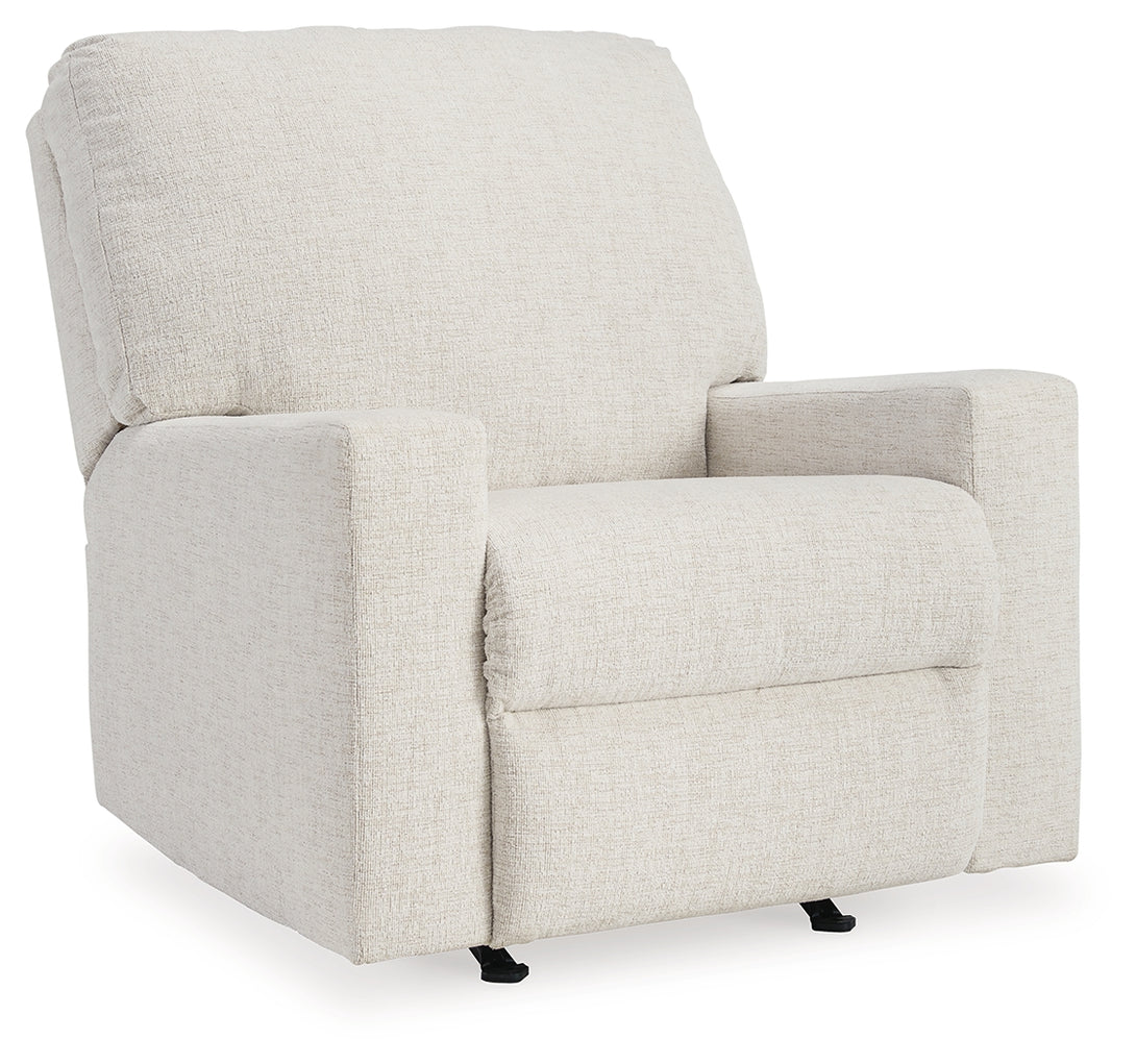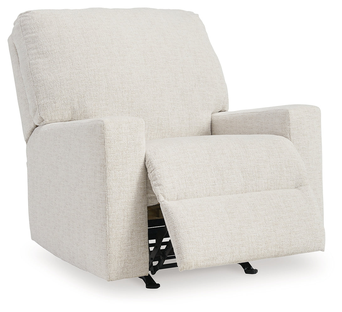 Bring comfort and fresh style to your living space with the Rannis Rocking Recliner in Snow. Featuring a clean, contemporary design, this recliner offers a soothing rocking motion and easy pull-tab reclining. Crafted with reinforced frame construction, high-resiliency foam cushions, and durable polyester upholstery, it’s built to last for everyday relaxation.