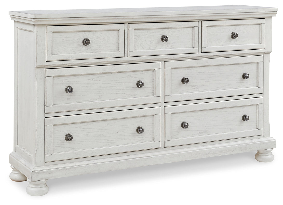 Bring sophistication and classic charm into your home with the Robbinsdale Dresser and Mirror Set. Showcasing an antiqued white finish with beautiful woodgrain texture, this bedroom essential combines both style and practicality. The dark bronze-tone hardware adds a refined, vintage touch that complements the elegant design.