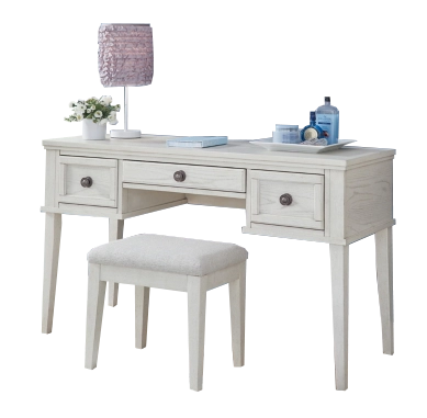 Elegant and timeless, the Robbinsdale Dressing Table with Stool brings refined charm to your bedroom. Crafted from wood, select oak veneer, and engineered wood, it features an antiqued white finish with a beautiful grain texture. The table includes three smooth-gliding drawers with dovetail joints and metal ball-bearing side glides, ideal for storing beauty essentials and accessories. The included cushioned stool, upholstered in woven polyester, provides everyday comfort with style.