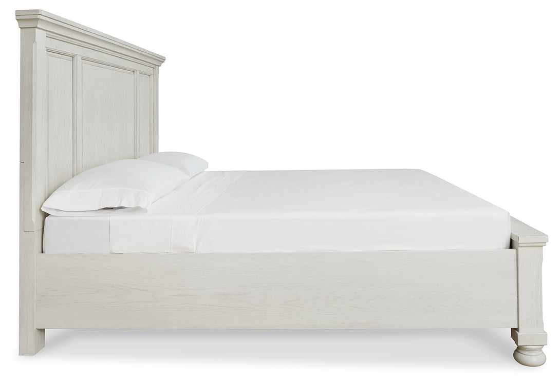 Classic elegance meets practical functionality with the Robbinsdale King Panel Storage Bed. Crafted in an antiqued white finish with rich grain texture, this grand piece brings timeless charm to your bedroom while cleverly concealing storage. Dark bronze-tone knobs add an ornate contrast to the design, enhancing its traditional appeal.