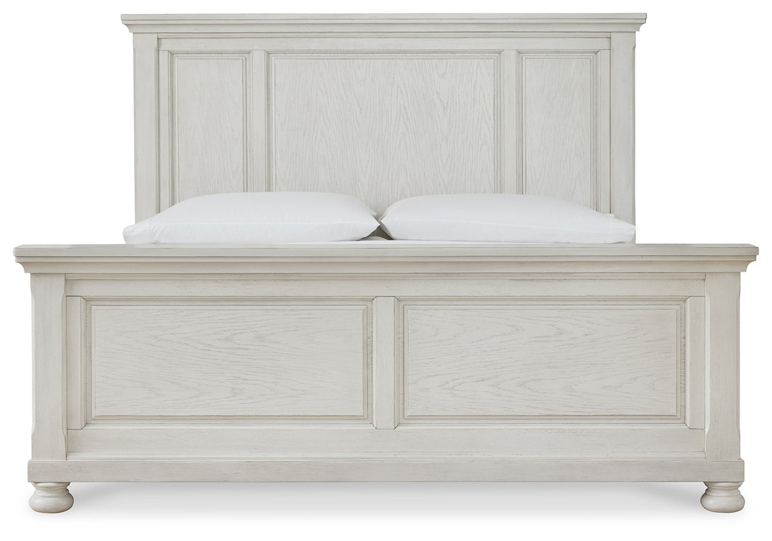 Bring timeless elegance and refined sophistication to your bedroom with the Robbinsdale Queen Panel Bed. Finished in a soft antiqued white with visible grain texture, this bed radiates classic charm and durability. The elegant panel design pairs beautifully with traditional and farmhouse interiors, making it a standout centrepiece for any bedroom setting.