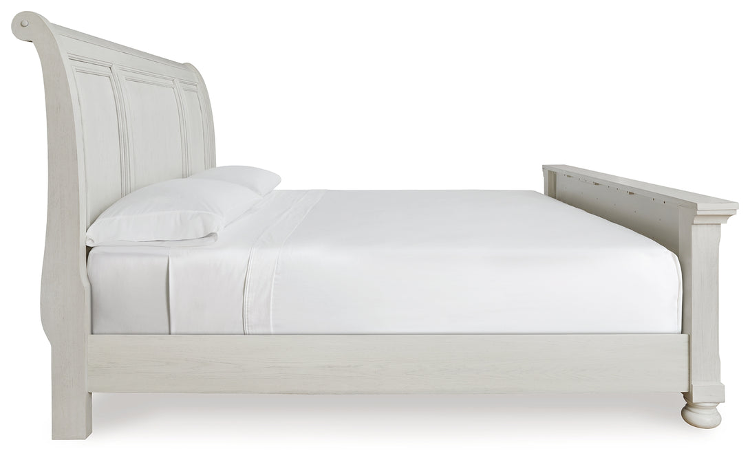 Bring timeless sophistication to your bedroom with the Robbinsdale Queen Sleigh Bed. Featuring an elegant sleigh headboard and panel footboard, this bed is finished in a soft antiqued white with a distinct grain texture that adds warmth and depth. Crafted from a combination of select oak veneer, engineered wood, solid timber and cast resin components, this bed is built to last for years to come.