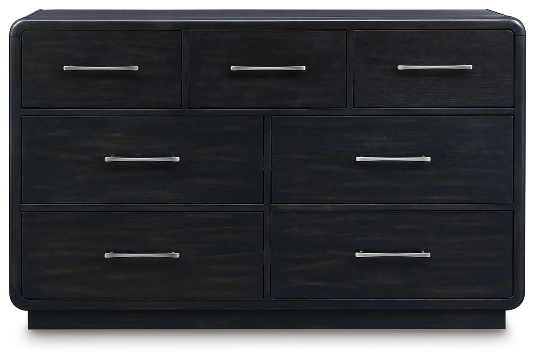 Bring art deco elegance into your bedroom with the Rowanbeck 7-Drawer Dresser. Expertly crafted from hardwood solids and ash veneer, this dresser features a rich layered black finish that highlights its softly curved silhouette and textured wood grain surface. Seven spacious drawers provide ample storage, gliding smoothly on ball-bearing slides with dovetail construction for added durability. Burnished nickel-tone pulls and waterfall edges add a refined touch to this statement piece, making it both functional and stylish.