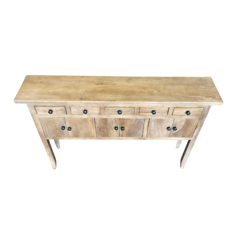 Designed for everyday living and built to last, the hall table includes five upper drawers and six lower cupboard doors—ideal for storing keys, mail, chargers, accessories and more while keeping your home tidy.