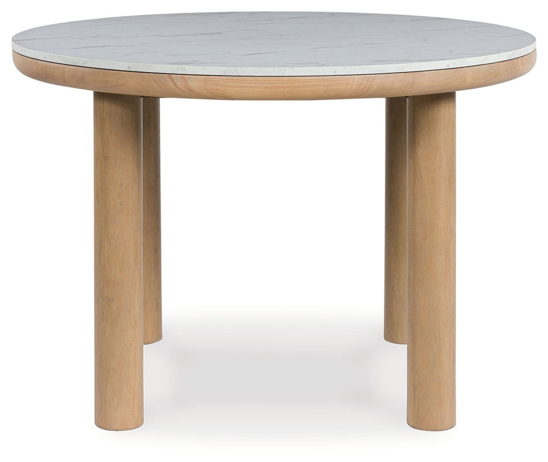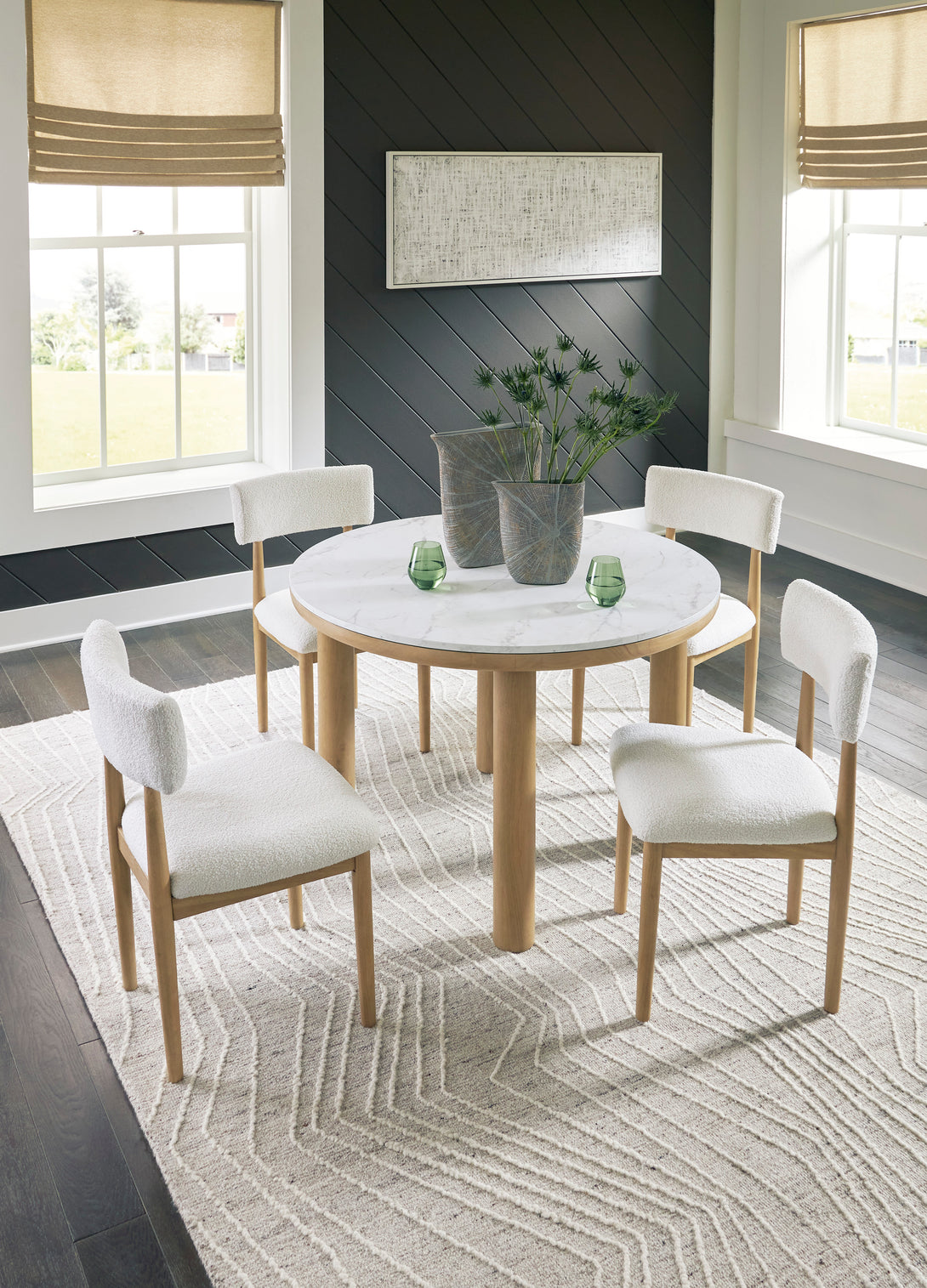 Clean lines meet cool curves with the Sawdyn 5 Piece Round Dining Setting. This modern dining set includes a round table with chunky post legs and a natural finish, paired with four dining chairs in soft white boucle upholstery. The replicated white marble top adds a fresh, upscale feel—perfect for casual dining spaces.