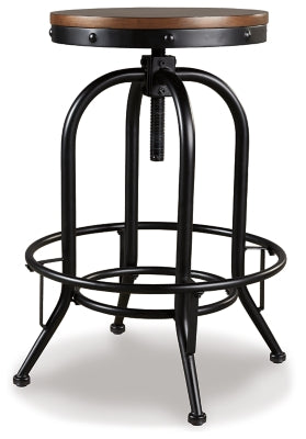 Bring rustic-industrial style into your home with the Valebeck Adjustable Bar Height Stool. Perfect for a kitchen bar, entertaining space, or dining area, this stool combines vintage charm with modern strength. The rich brown wood-veneer seat sits atop a sturdy black metal base, delivering both style and everyday durability.